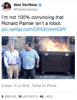 A YouTube user even created a channel called "Robot Alien Richard Painter," featuring some of Painter's more hyperbolic clips. The frequent MSNBC guest is known for regularly accusing President Trump of "treason."