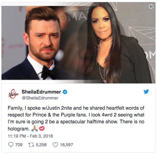 "Family, I spoke w/Justin 2nite and he shared heartfelt words of respect for Prince & the Purple fans," Sheila E. tweeted. "I look 4wrd 2 seeing what I’m sure is going 2 be a spectacular halftime show. There is no hologram."