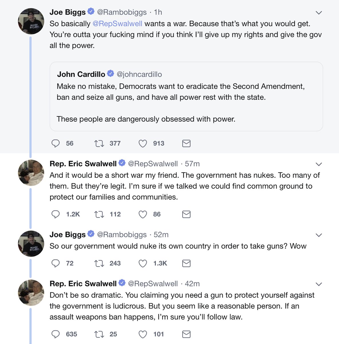 The comments came during a Twitter debate over restricting Americans’ access to guns. Radio host Dana Loesch reported on a Swalwell bill that calls for confiscating semi-automatic rifles.