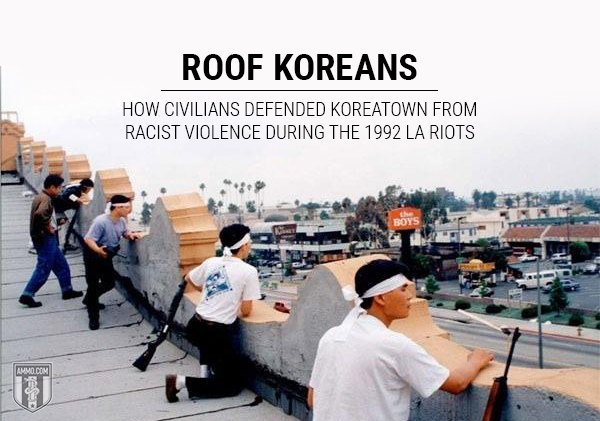 The Roof Koreans were spontaneous self-defense forces organized by the Korean community of Los Angeles, primarily centered in Koreatown, in response to violent and frequently racistattacks on their communities and businesses by primarily black looters and rioters during the Los Angeles Riots of 1992. Despite their best efforts, over 2,200 Korean-owned businesses were looted or burned to the ground during the riots. It is chilling to imagine how many would have suffered the same fate had the Koreans not been armed.