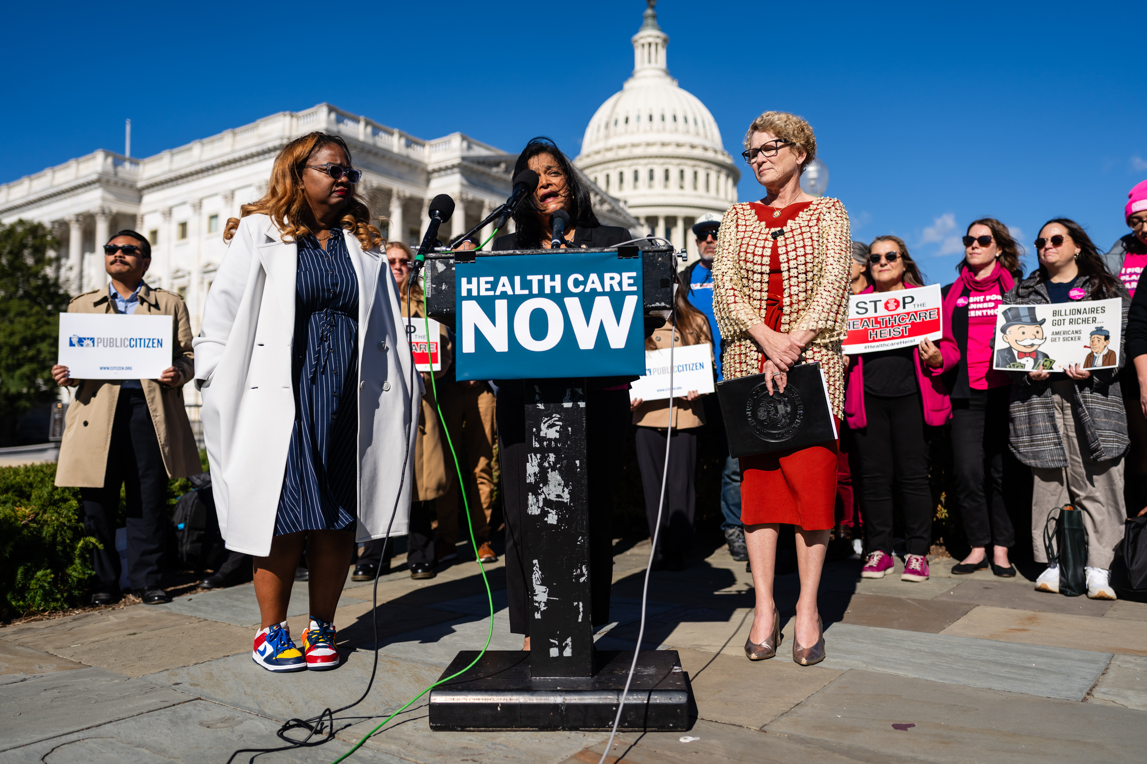 WASHINGTON, DC - NOVEMBER 6: Representative Pramila Jayapal (D-WA), center, speaks alongside April Verrett, president of the Service Employees International Union, left, and Representative Chrissy Houlahan (D-PA), right, during a news conference with Congressional Democrats outside of the U.S. Capitol on November 6, 2025 in Washington, DC. The news conference focused on the lasting effects of the government shutdown on health care costs and Supplemental Nutrition Assistance Program benefits. (Photo by Eric Lee/Getty Images)